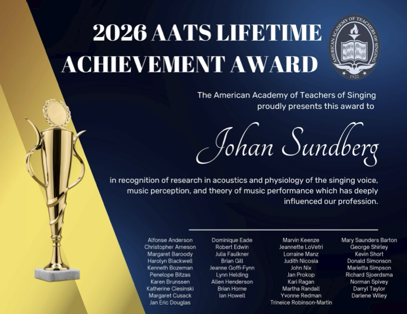 The American Academy of Teachers of Singing is pleased to recognize Johan Sundberg with a 2026 AATS Lifetime Achievement Award “In recognition of research in acoustics and physiology of the singing voice, music perception, and theory of music performance which has deeply influenced our profession.